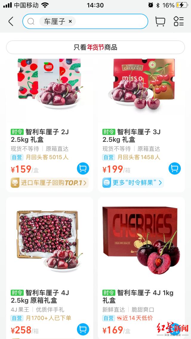 2J和3J规格的车厘子价格也较上市初期下降超过30%,相较比往年价格几乎腰斩。
