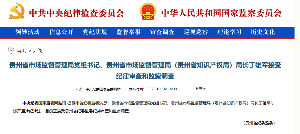 贵州省市场监督管理局党组书记丁雄军接受纪律审查和监察调查 酒水食空 2025-01-02 2875 中央纪委国家监委网站讯 据贵州省纪委监委消息:贵州省市场监督管理局党组书记、贵州省市场监督管理局(贵州省知识产权局)局长丁雄军涉嫌严重违纪违法,目前正接受贵州省纪委监委纪律审查和监察调查。 责任编辑:王丛