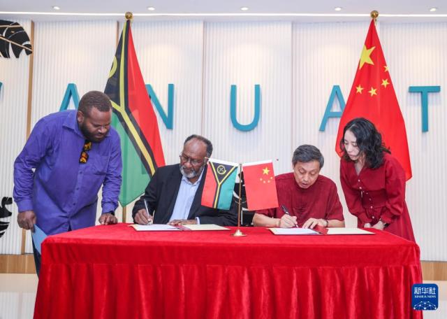 这是1月2日在瓦努阿图首都维拉港拍摄的救灾物资交接仪式。