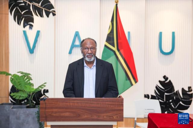 1月2日,在瓦努阿图首都维拉港,瓦努阿图看守政府总理萨尔维在救灾物资交接仪式上致辞。