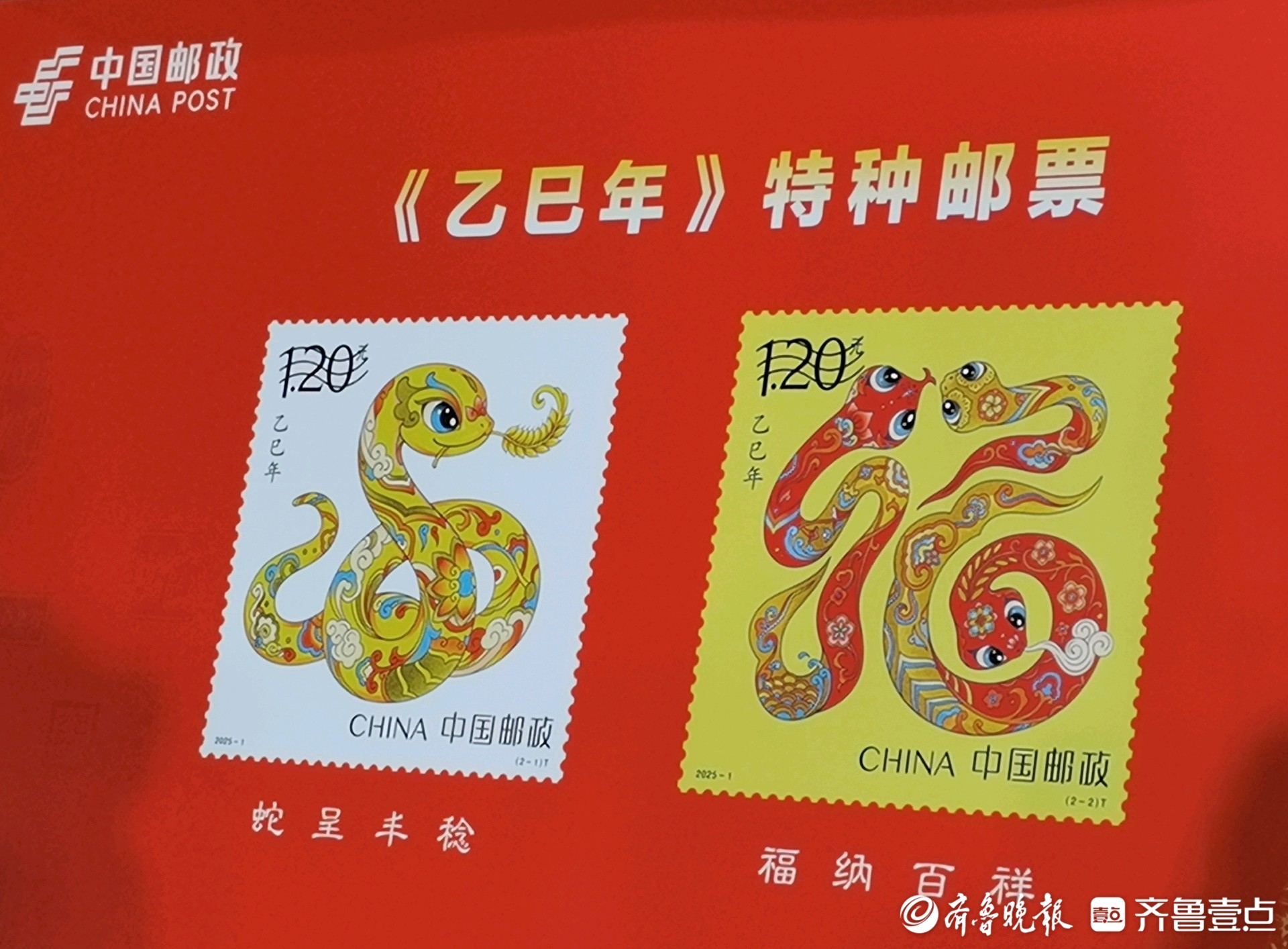 据了解,《乙巳年》特种邮票一套2枚,邮票图案名称分别为蛇呈丰稔、福纳百祥,全套邮票面值为2.40元。该套邮票由潘虎、张旺设计。以敦煌壁画和传统民俗为灵感来源,将蛇的形象与吉祥寓意巧妙结合,既体现了生肖文化的独特魅力,又凝聚了朴素灵活的民间智慧。第一枚图名为“蛇呈丰稔”,画面提炼了中华传统文化中盘蛇的灵动意象,加以喜庆装饰应和年节氛围。金色的蛇躯蜿蜒,口中衔着一束“嘉禾”,象征着“仓廪实,衣食足”的美好图景。蛇身金光熠熠,与璀璨的麦穗交相辉映,仿佛绘就了一幅丰收时节金光灿烂、富饶满溢的画卷,寓意着风调雨顺之年,五谷丰登之景,以及国泰民安的盛世祥和。第二枚图名为“福纳百祥”,画面以草书笔意将三条蛇创意性地构成了“福”的字形,简练洒脱、柔美顺通。两大一小三条蛇之间情感细腻流动,顾盼生姿,生动展现了阖家欢乐的温馨场景,寓意着和合共生、福满人间,寄托了人们对美好生活的无限追求与诚挚祈愿。两枚邮票不仅是对生肖之美的再次诠释,更是对盛世安康、福泽四季的深情祝福。自发行之日起,在全国指定邮政网点、集邮网厅(https://jiyou.11185.cn)、中国邮政手机客户端、中国邮政微邮局集邮微信商城和中国邮政商城微信小程序出售,出售期限6个月。