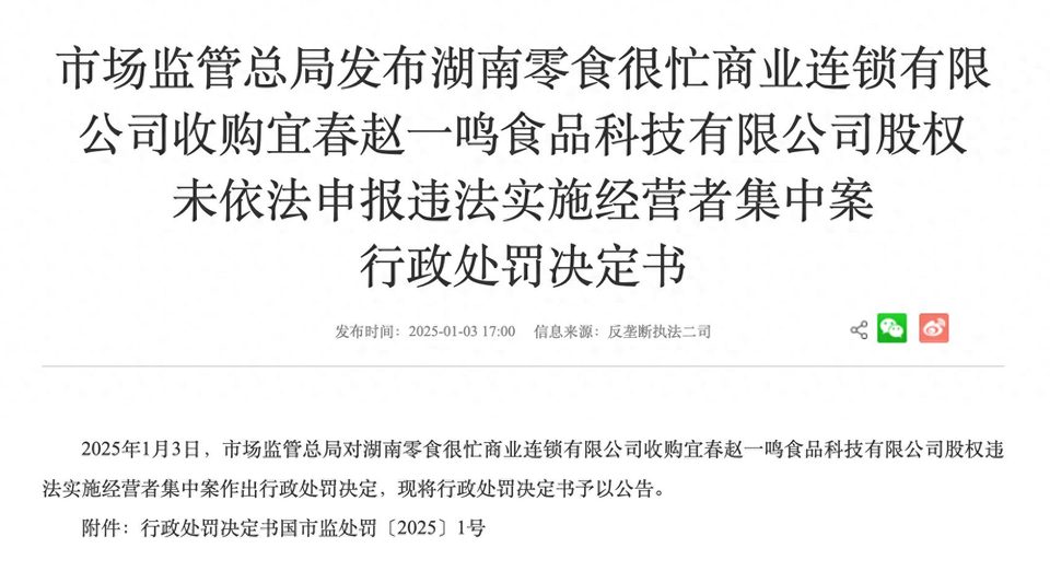 1月3日,国家市场监督管理总局发布行政处罚书称,国家市场监管总局于2023年11月27日接到举报线索,经核查,涉及的交易为鸣鸣很忙公司收购赵一鸣公司股权。2024年8月6日,国家市场监管总局根据《反垄断法》对案件进行立案调查。