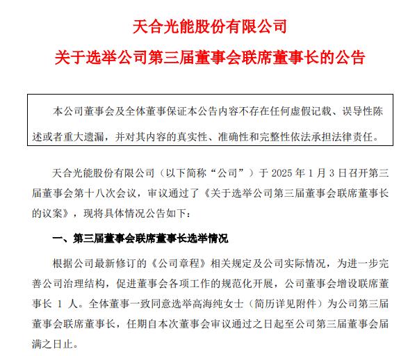 近日,科创板上市公司天合光能发布公告称,高海纯被任命为公司第三届董事会联席董事长,并兼任解决方案事业群总裁。