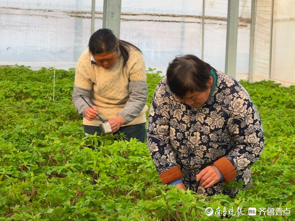 在菏泽花王牡丹产业园的一处温室大棚内,花农们正在忙着给牡丹花苞涂抹催花剂。“今年,我们创新了催花牡丹新模式,新建了连栋温室大棚。连栋温室大棚相较于传统的大棚光源更充分,不会造成牡丹的趋光和叶片的黄化。”菏泽花王牡丹产业园总经理赵文双说道。