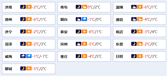 最低气温:鲁西北、鲁中山区和半岛内陆地区-5℃左右,其他地区-3℃左右。