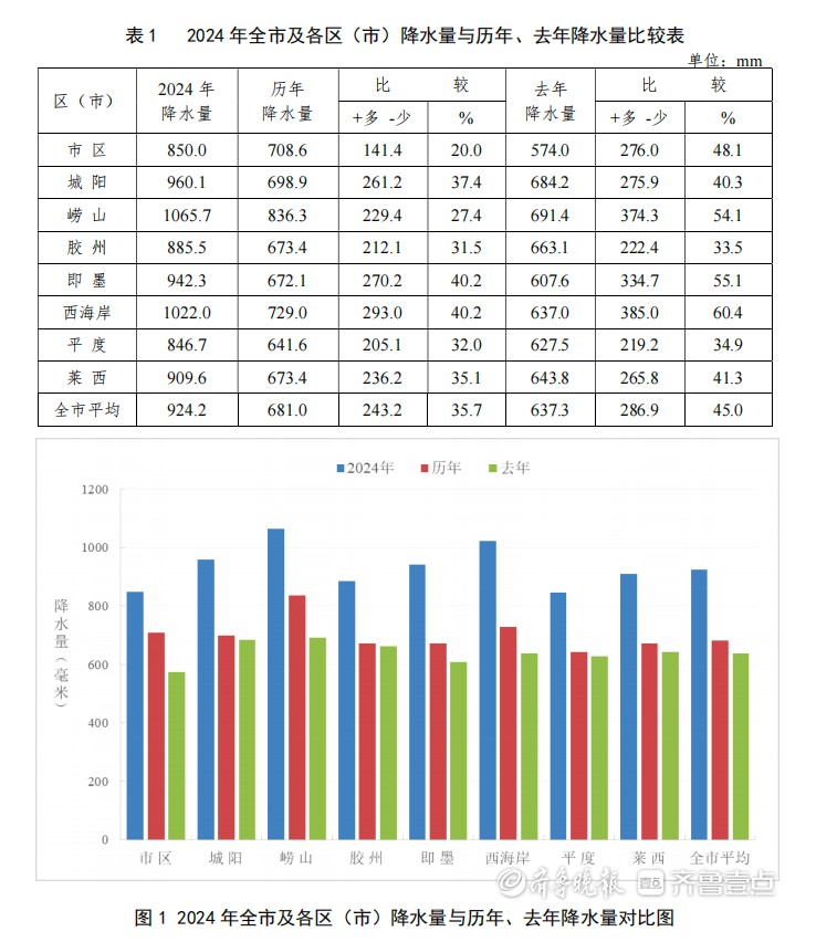 2024年,全市平均降水量924.2毫米,较历年偏多35.7%,较去年偏多45.0%,列1952年有水文统计资料以来历史同期第9位。崂山区平均降水量最大,为1065.7毫米,平度市平均降水量最小,为846.7毫米。
