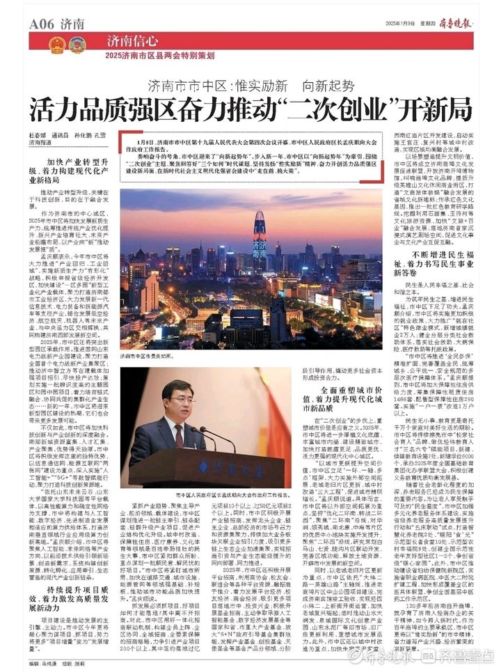 作为济南市的中心城区,2025年市中区将加快发展新质生产力,统筹推进传统产业优化提升、新兴产业培育壮大、未来产业前瞻布局,以产业向“新”推动发展提“质”。