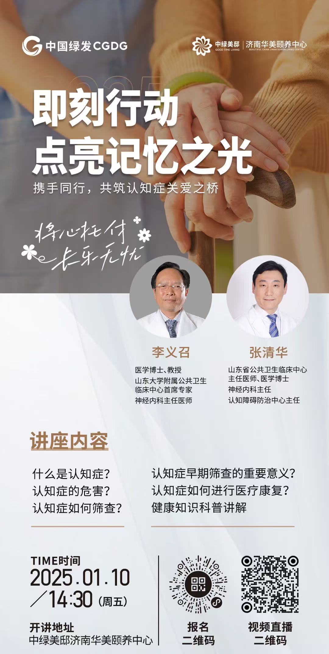 1月10日下午2:30,中绿美邸济南华美颐养中心将举办以“即刻行动,点亮记忆之光”为主题的认知症公益讲座活动。本次活动特别邀请到医学博士、教授、山东大学附属公共卫生临床中心首席专家、神经内科主任医师李义召教授,医学博士、主任医师、山东大学附属公共卫生临床中心神经内科主任、认知障碍防治中心主任张清华教授。两位专家将为大家共同讲解认知症的成因、类型、早期症状识别及最新的治疗与护理进展,同时对长者健康知识进行普及。