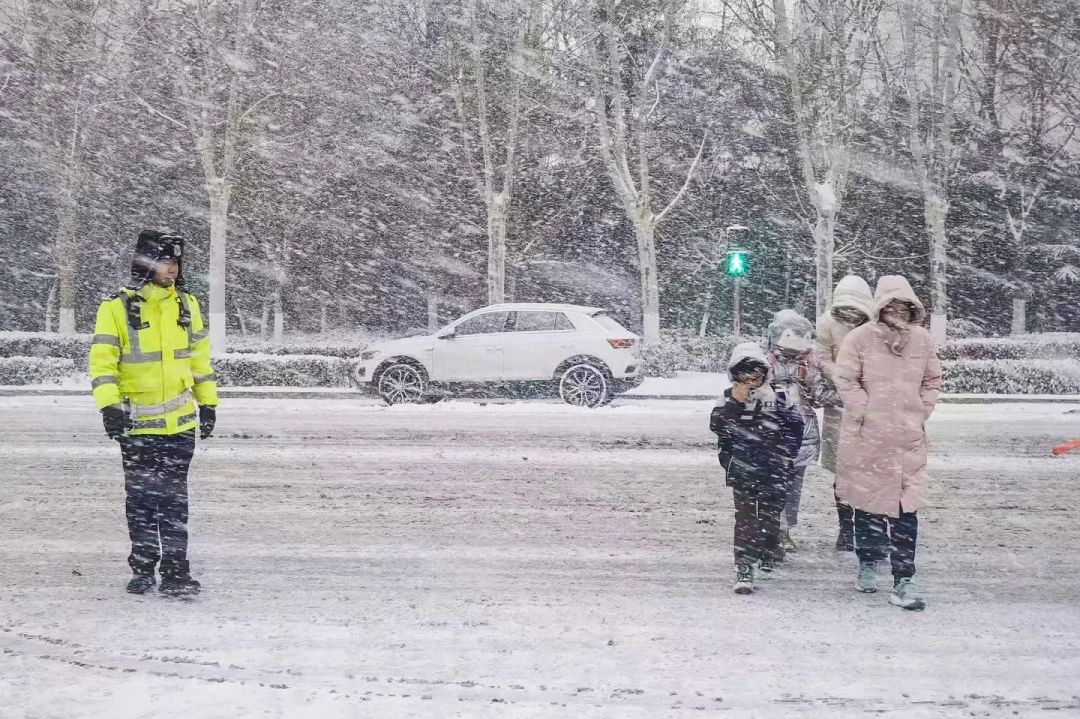 烟台交警风雪中站好“护学岗”,护送学生安全通过马路。