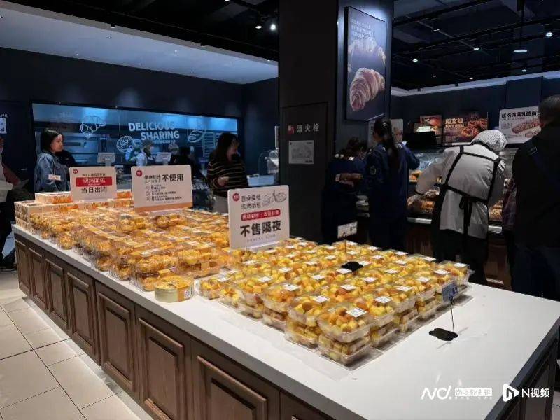 熟食区域聚集了最多的客流量,也是现场唯一稍微等候的区域,该区域售卖韩式炸鸡、烤乳猪、豆瓣甜肠、卤水猪蹄等等,并且提供免费试吃。此外,超市里的烘焙区、生鲜区同样有较多客流,烘焙区贴出告示强调现烤面包当日出清,不好吃可免费退。1月9日,永辉南沙万达店相关负责人告诉记者,目前门店销售靠前的品类为水果、熟食、烘焙和休闲小吃及饮料。