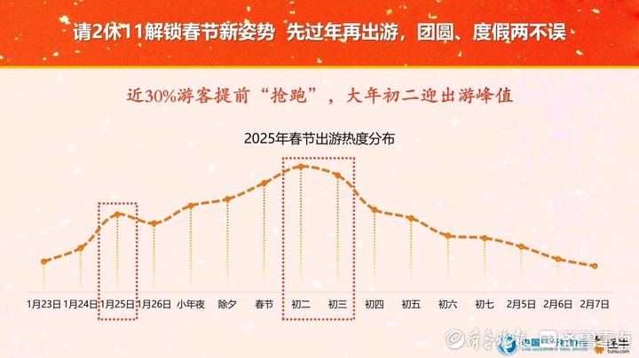 近日,中国旅行社协会联合途牛旅游网发布《2025春节旅游消费趋势报告》(以下简称“报告”)。《报告》综合中国旅行社协会相关统计、途牛截至目前最新春节旅游产品预订数据,对2025春节旅游消费趋势进行预测分析。