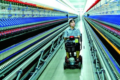 青岛一家纺织公司生产车间内,工人在巡检智慧纺纱生产线。梁孝鹏摄/光明图片