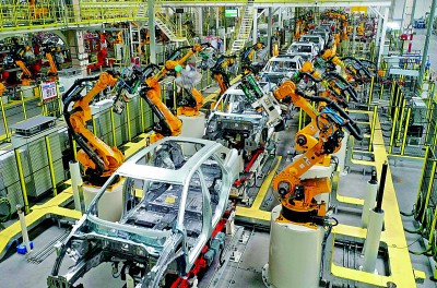 位于青岛市即墨区的一家汽车公司焊装车间,机器人在进行焊接作业。梁孝鹏摄/光明图片