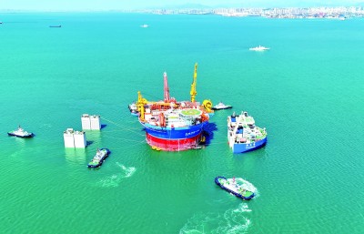 亚洲首艘圆筒型浮式生产储卸油装置“海葵一号”从青岛西海岸新区海西湾离港启运。张进刚摄/光明图片