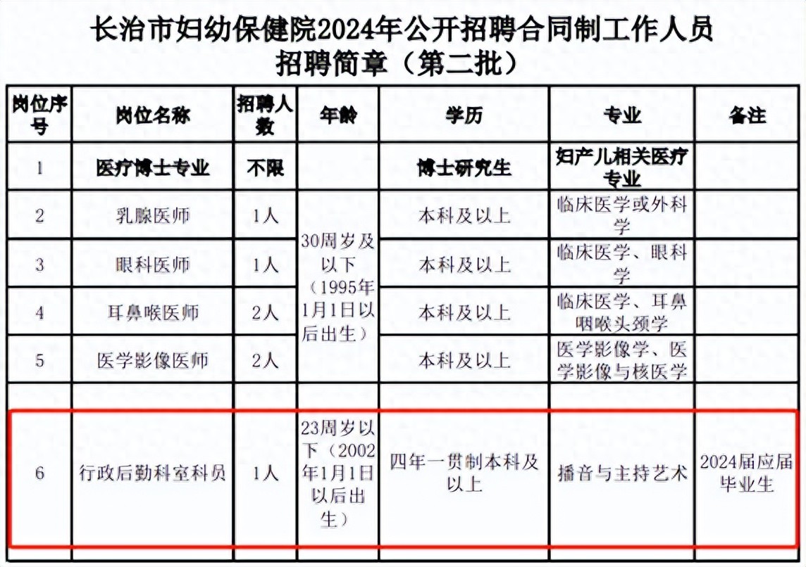 近日,山西长治一医院公开招聘合同工,其中“行政后勤科”招聘一名2024届应届播音主持专业工作人员,被一些网友质疑“萝卜岗”。