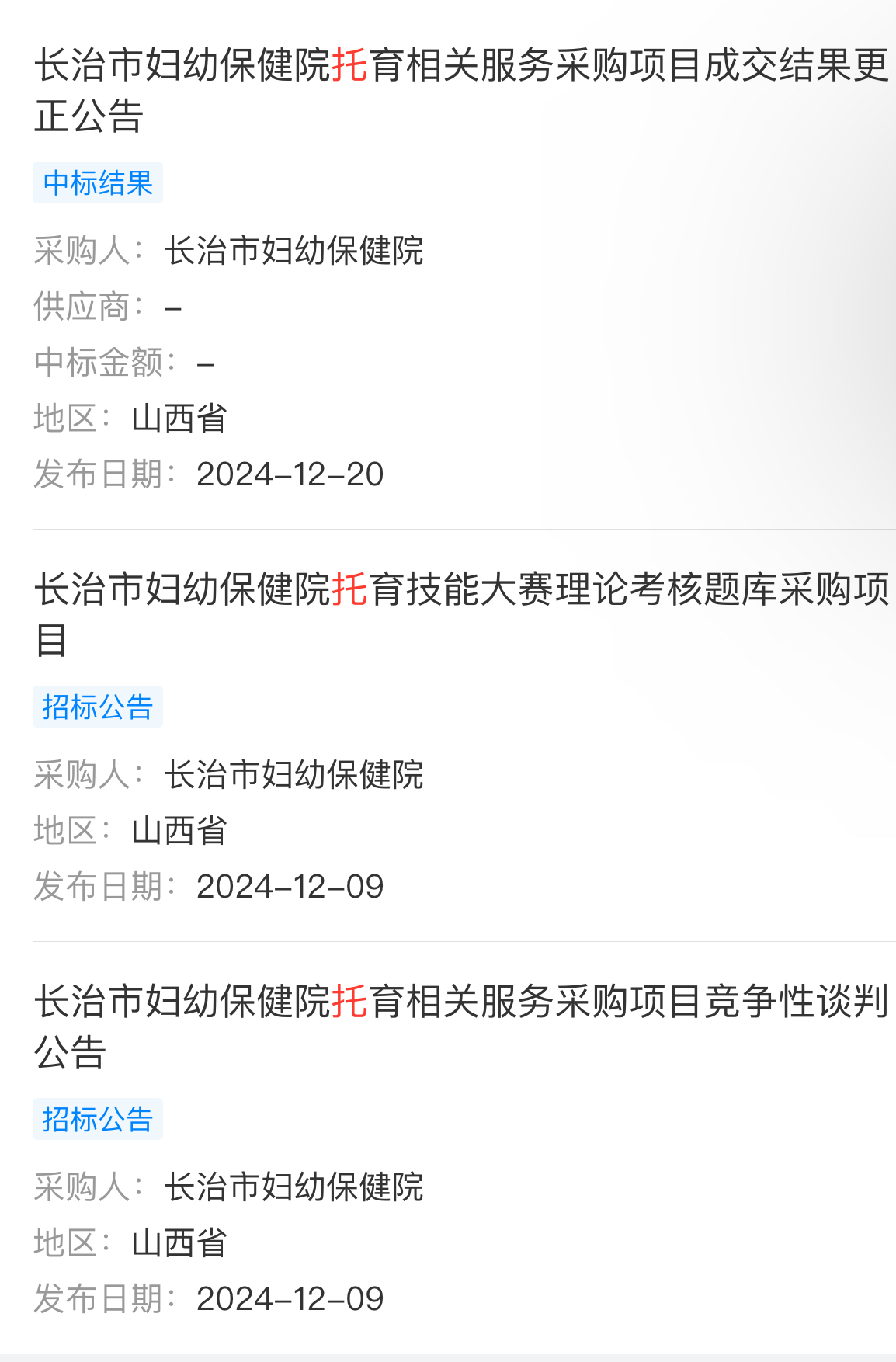 天眼查显示,长治市妇幼保健院在2024年12月,发布至少两条“托育”相关的外包招标信息。