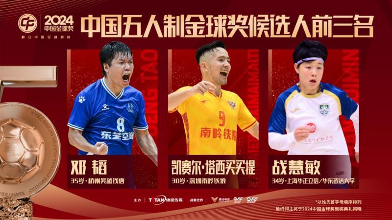 在2024中国五人制金球奖的评选中,杭州吴越钱唐俱乐部的老将邓韬、深圳南岭铁狼俱乐部的射手凯赛尔以及上海华正立信女足的核心战慧敏入围前三,这意味着本奖项将诞生一位新科得主。