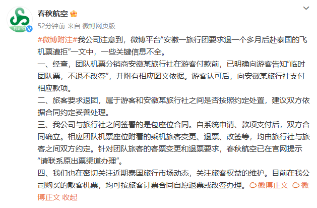 1月14日,春秋航空官方微博发文称:我公司注意到,微博平台“安徽一旅行团要求退一个多月后赴泰国的飞机票遭拒”一文中,一些关键信息不全。