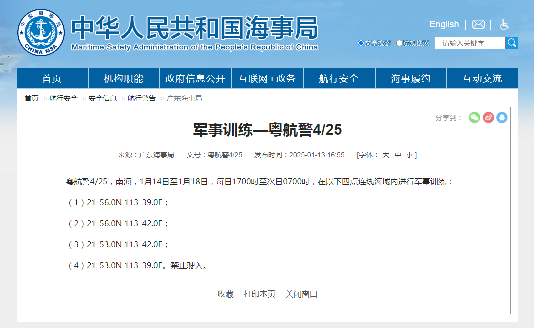 航行警告!南海部分海域进行军事训练 中国海事局网站 2025-01-14 2741 据中国海事局网站消息,1月13日,广东海事局发布航行警告: 1月14日至1月18日,每日17时至次日7时,南海部分海域内进行军事训练,禁止驶入。 (中国海事局网站) 责任编辑:吴佳