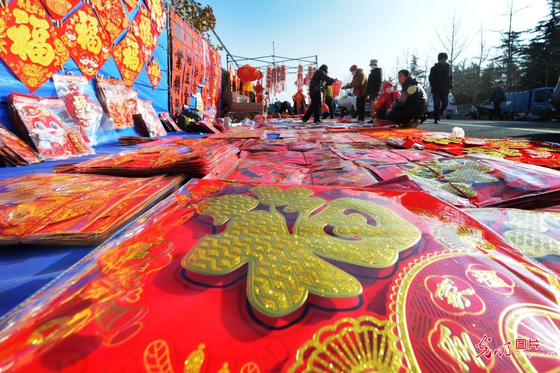 2025年1月6日,在山东省青岛市城阳区流亭街道双埠社区年货大集上,人们在对联摊位选购福字。(王海滨摄/光明图片)