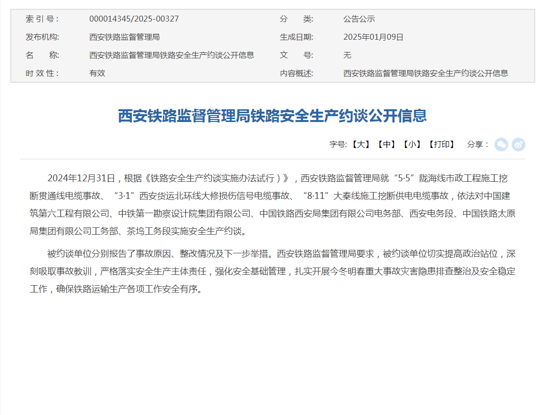 2024年12月31日,根据《铁路安全生产约谈实施办法试行)》,西安铁路监督管理局就“5·5”陇海线市政工程施工挖断贯通线电缆事故、“3·1”西安货运北环线大修损伤信号电缆事故、“8·11”大秦线施工挖断供电电缆事故,依法对中国建筑第六工程有限公司、中铁第一勘察设计院集团有限公司、中国铁路西安局集团有限公司电务部、西安电务段、中国铁路太原局集团有限公司工务部、茶坞工务段实施安全生产约谈。