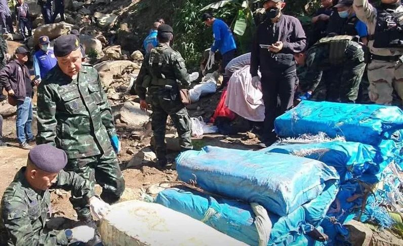 泰国军队连夜确保该地区安全后,于黎明时分进行搜查,并发现大量毒品,以及四名走私嫌疑犯弹孔累累的尸体。