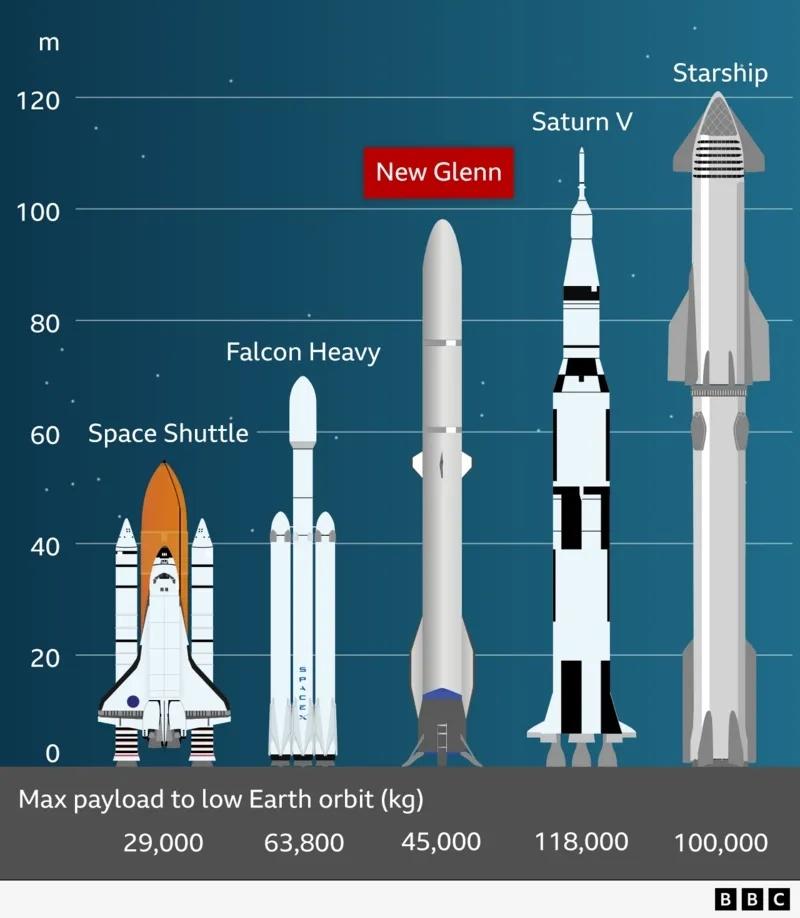 据该公司介绍,“新格伦号”火箭以美国首个完成绕地球轨道飞行的宇航员约翰·格伦的名字命名,火箭高98米,第一级配有7台强大发动机,设计目标是至少进行25次飞行。“新格伦号”可承载各种有效载荷,前往多个目的地,以满足广泛的客户需求并降低每次发射成本。