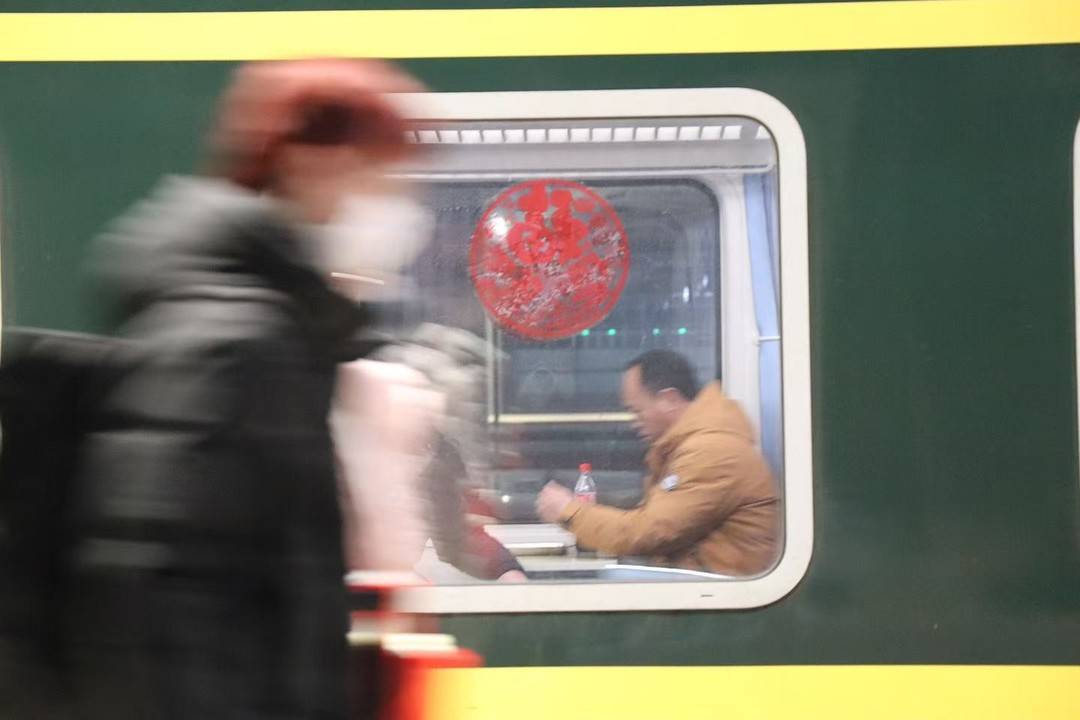 列车从丰台站开出前2小时,乘务员就将列车内的桌椅、车窗、洗脸池等设施擦得干干净净,并贴上窗花、对联,挂起灯笼、中国结,车厢里立刻充满年味。