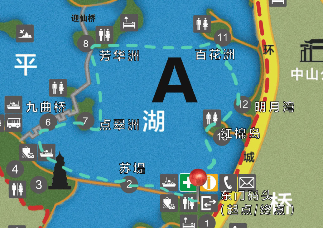 线路A:(上船点)东门码头——苏堤——九曲桥——点翠洲——芳华洲——百花洲——明月湾——红棉岛——东门码头