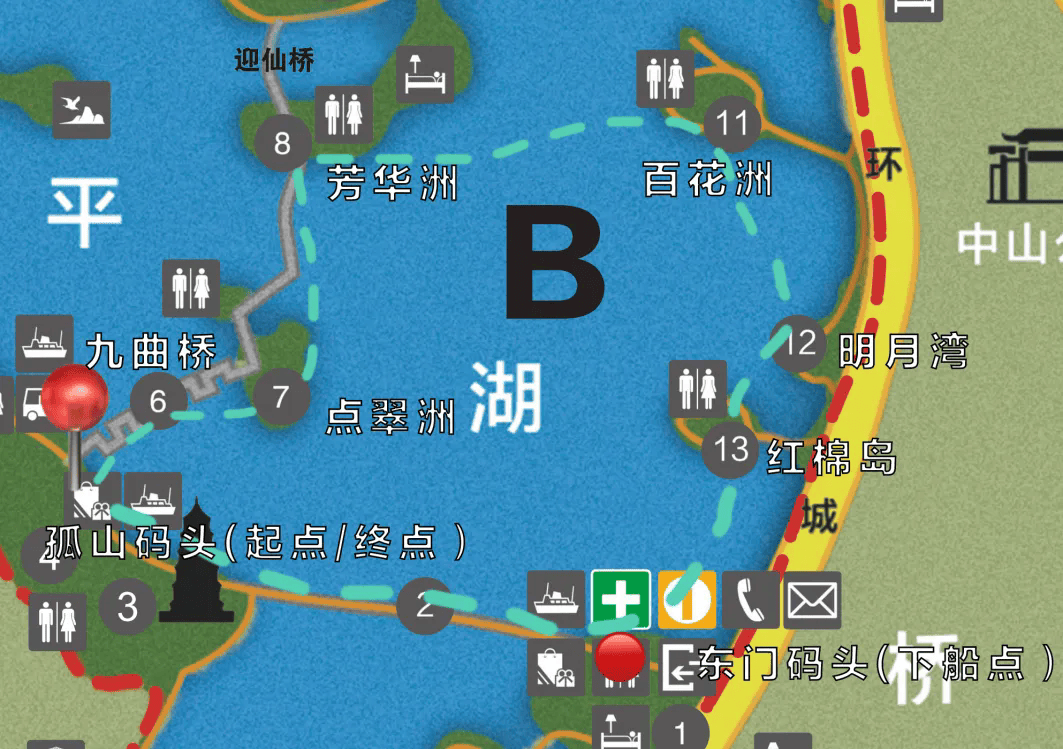 线路B:(上船点)孤山码头——九曲桥——点翠洲——芳华洲——百花洲——明月湾——红棉岛——东门码头(下船点)——孤山码头(终点)