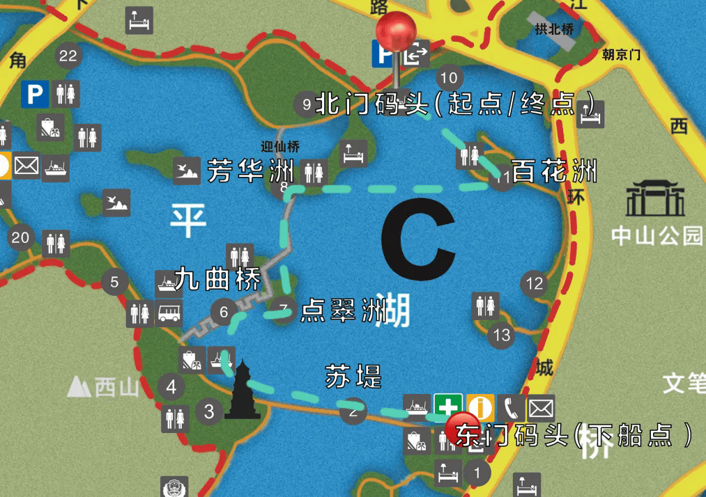 线路C:(上船点)北门码头(慈云码头)——百花洲——芳华洲——点翠洲——九曲桥——苏堤—— 东门码头(下船点)——北门码头(终点)