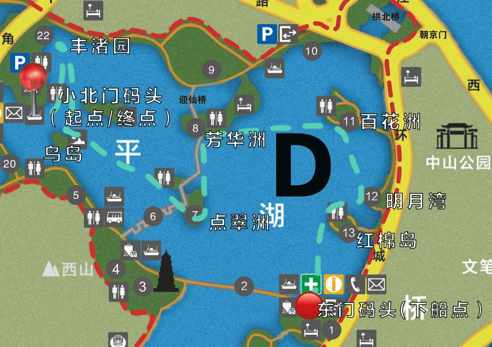 线路D:(上船点)(小北门码头)鳄湖码头——丰渚园——鸟岛——点翠洲——芳华洲——百花洲——明月湾——红棉岛——东门码头(下船点)——小北门码头(终点)
