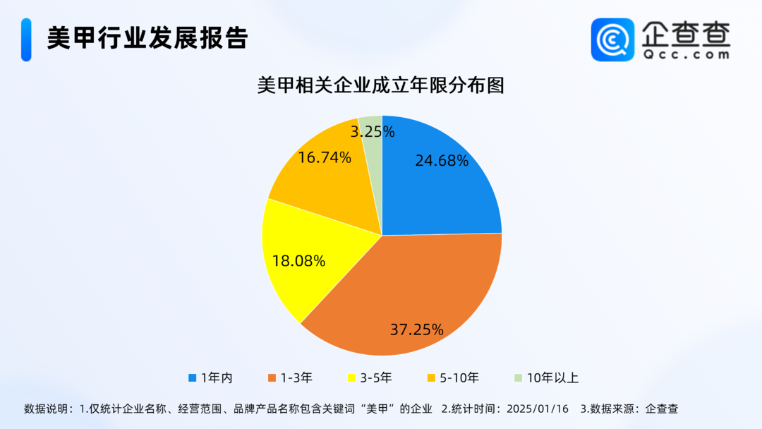 值得注意的是,企查查数据显示,从成立年限分布来看,超六成美甲相关企业成立于近三年,其中成立年限在1-3年的相关企业占比最大,为37.25%。在1年内成立的美甲相关企业占比24.68%。成立10年以上的美甲相关企业仅占3.25%。