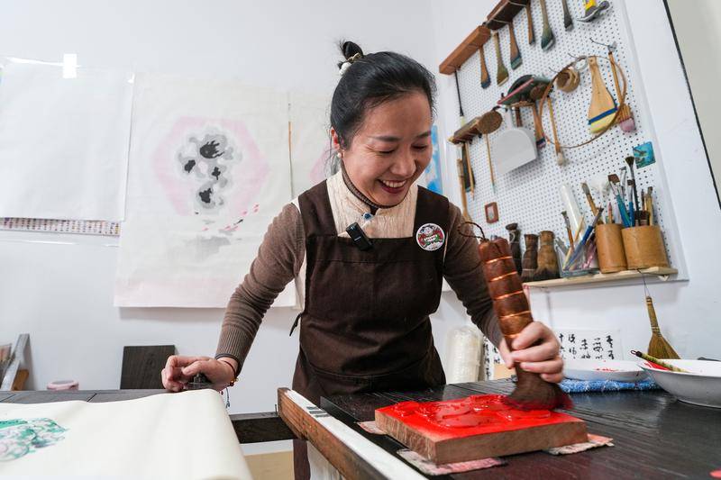 临近春节,苏州市姑苏区大儒巷38号的平江文化中心内一片热闹,不少游客在桃花坞木版年画展示销售中心一团和气馆中,体验年画制作过程,选购非遗文创产品,沉浸式感受中华优秀传统文化的独特魅力。“蛇年要来了,我特意来买一些与生肖相关的年画和趣味摆件,为家中增添喜庆和福气。”市民杜女士说。