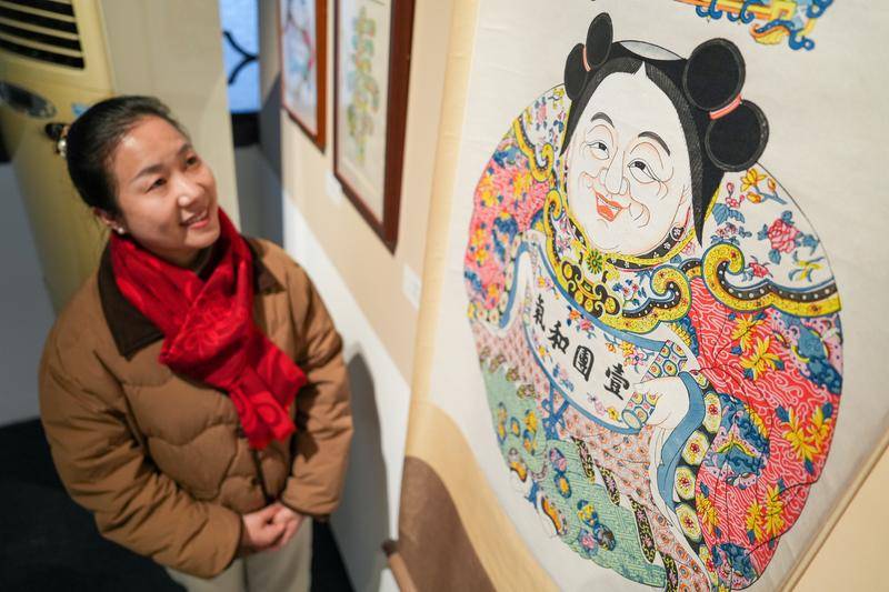 1月8日,乔兰蓉在观看桃花坞木版年画作品《一团和气》。新华社记者 李博 摄