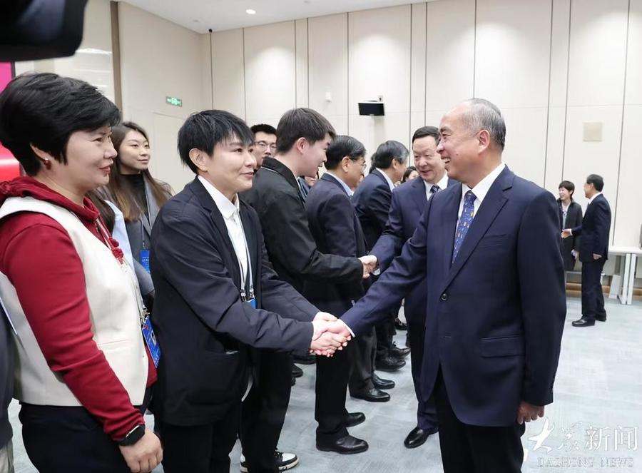 林武一行与新闻工作者、工作人员代表一一握手、亲切交流。林武说,省两会是全省人民政治生活中的一件大事。大会的成功召开,离不开新闻工作者和工作人员的辛勤付出。两会期间,中央驻鲁媒体和省内媒体深入报道大会盛况和代表委员履职风采,推出了一批精品力作,全方位、多角度展示了山东“走在前、挑大梁”的生动实践,唱响了主旋律、传播了正能量、提振了精气神。两会工作人员认真履职尽责,用心用情用力做好各项服务保障工作,为大会顺利进行作出了积极贡献。