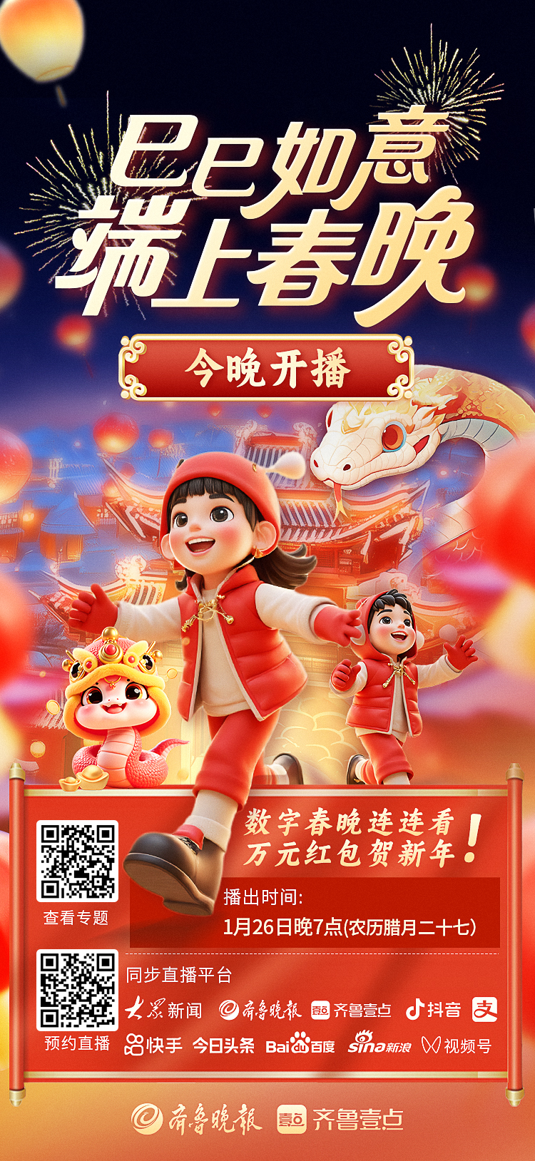 看节目,抢红包,新技术,新体验!2025端上春晚将会是一场数字春晚、文化春晚,也是一场科技春晚、百姓春晚,更是一场备受瞩目的“线上大联欢”,还在等什么?今晚7点,锁定齐鲁壹点,万元红包陪您红红火火过新年!