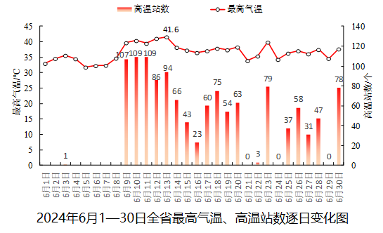2024年6月,全省平均高温日数达10天,较常年偏多6.7天,为1951年以来历史同期最多。9—15日、16—20日、25—28日出现3次大范围持续高温过程,有50县(市、区)出现40℃以上高温,极端最高气温达41.6℃(13日无棣),有6县(市、区)最高气温突破历史极值。全省用电负荷不断攀升,据省能源局统计,6月13日,全省用电负荷突破1亿千瓦,较2022年、2023年度分别提前51天和25天。