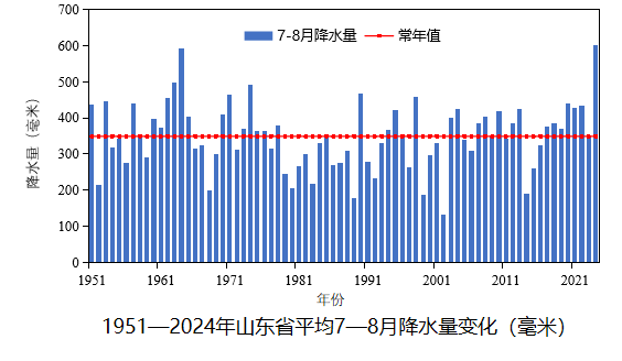 2024年盛夏(7—8月),全省平均降水量达600.8毫米,较常年(339.0毫米)偏多77.2%,平均暴雨日数达3.5天,较常年偏多1.8天,均为1951年以来历史同期最多。各市降水均较常年偏多3成以上,潍坊、东营、枣庄3市超本地年降水量常年值40~65毫米,平邑县最多达1107.6毫米。降水多有利于水资源供给,全省大中型水库、南四湖、东平湖8月底总蓄水量较常年同期偏多。同时,极端暴雨导致多地发生洪涝灾害。