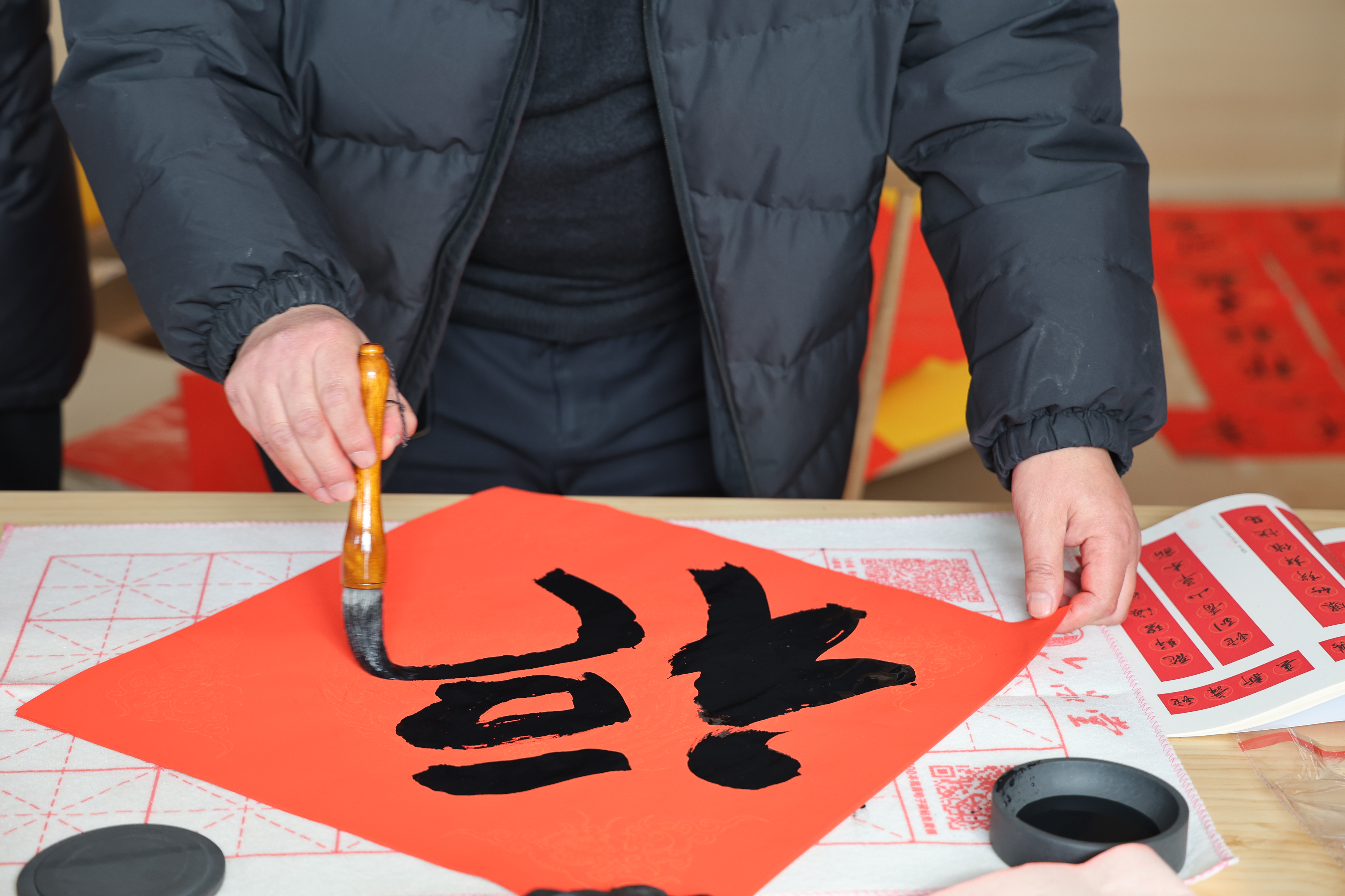 活动现场热闹非凡,翰墨飘香。书法志愿者挥毫泼墨,笔走龙蛇,一副副饱含新春祝福和时代气息的春联跃然纸上。一副副寓意美满的春联,一张张福气满溢的“福”字,摆满了桌面与地面,凝聚着大家对新年的美好祝愿。
