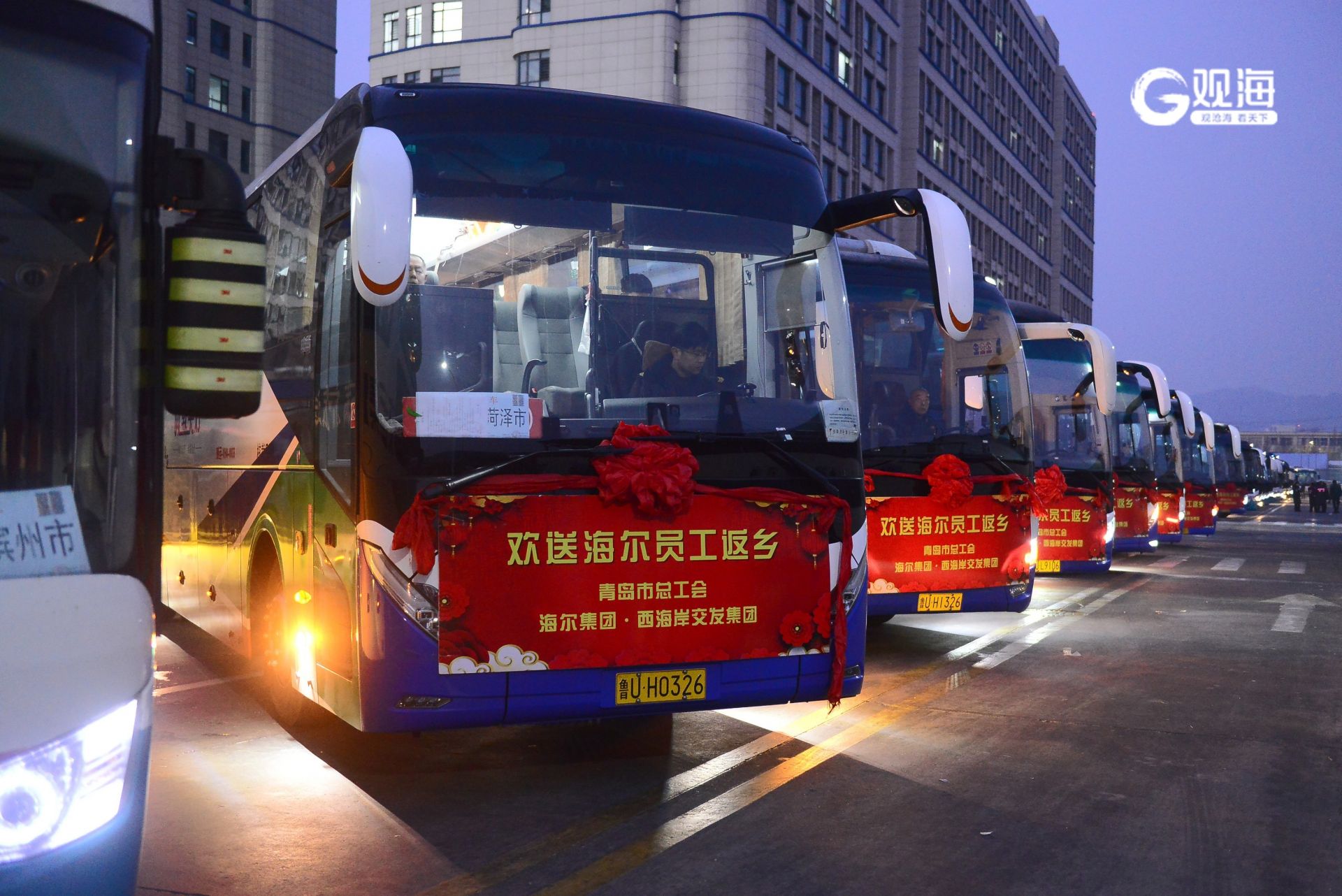青岛日报社/观海新闻1月25日讯 今天,青岛城运西海岸交通发展集团“职工返乡直通车”在海尔、海信、澳柯玛等三家企业位于青岛西海岸新区的园区起航,运送职工近6000人返乡过年。据悉,第一批返乡直通车于22日开通,今天是春节前最后一批,也是发车最集中的一次。
