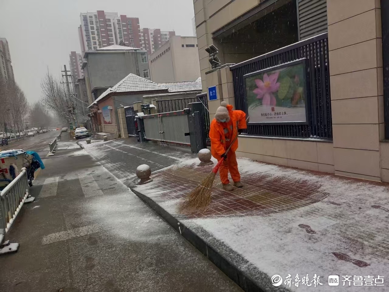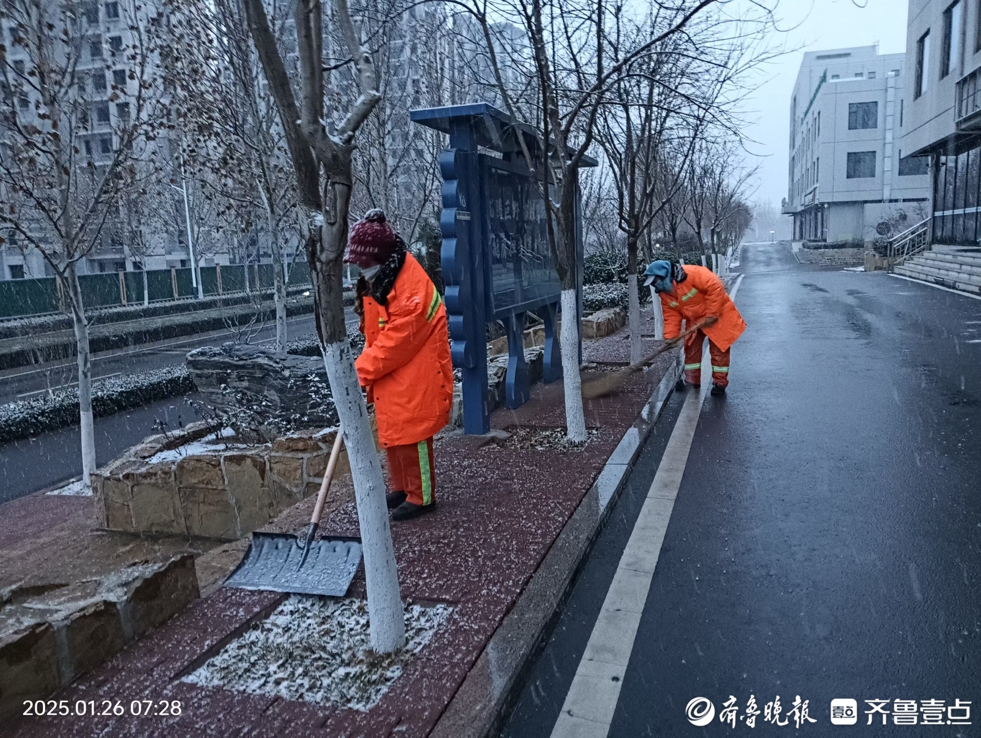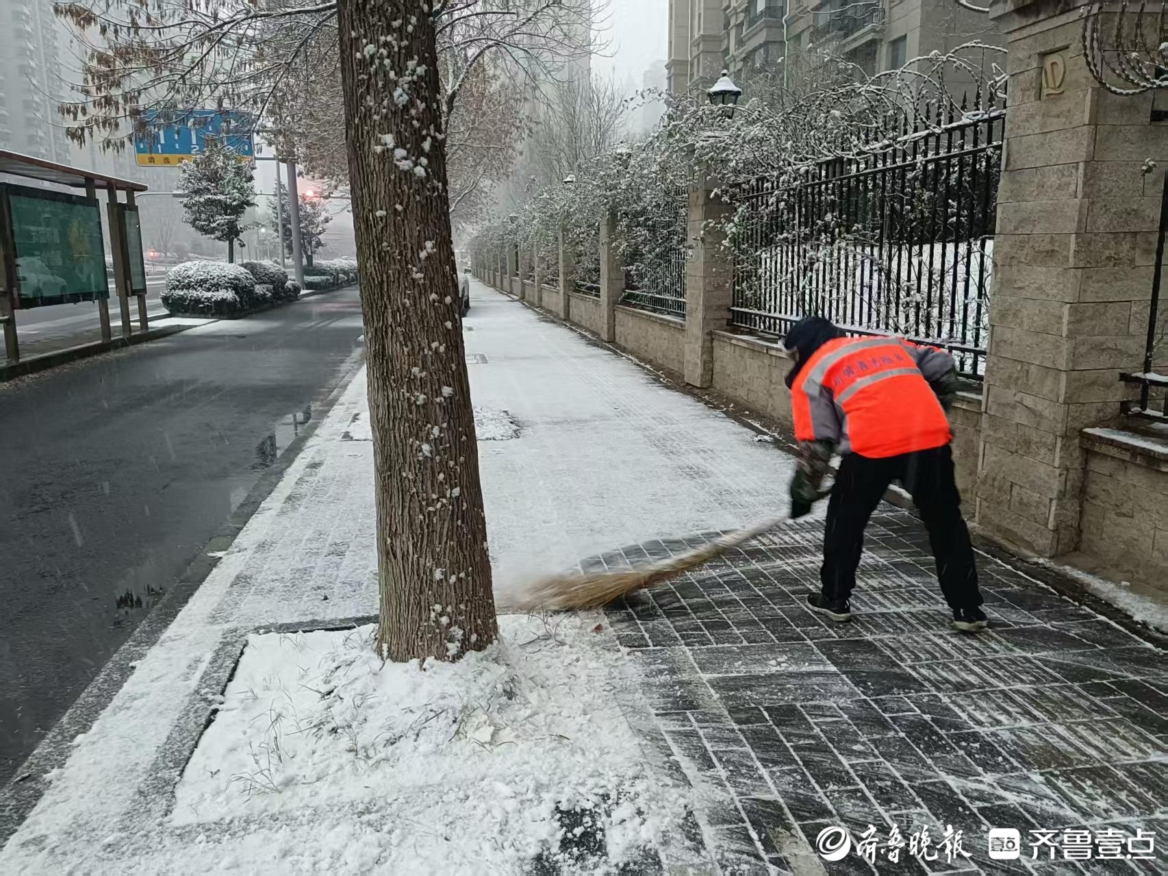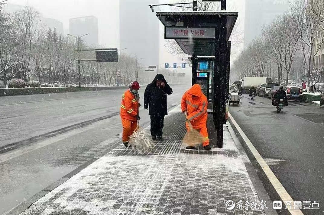 组图|2025年首场降雪已至,泉城环卫人坚守岗位忙碌中 壹现场 2025-01-26 7661 齐鲁晚报·齐鲁壹点 李梦瑶 1月26日,济南迎来2025年首场降雪。在一片白茫茫的街景中,环卫工人一早到达岗位, 他们的工作服显得格外耀眼。他们全副武装,手拿工具,清理积雪,成为雪中一道亮丽的风景线。 责任编辑:王杰