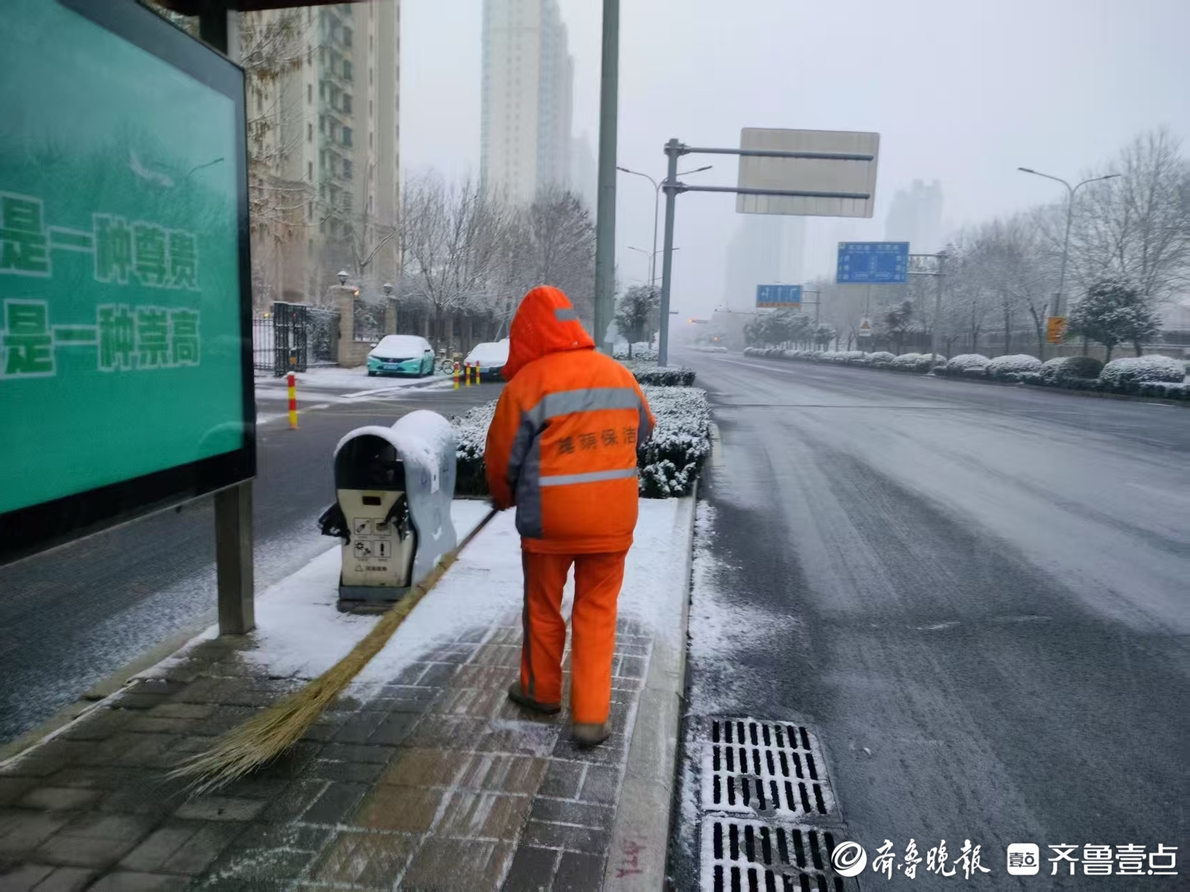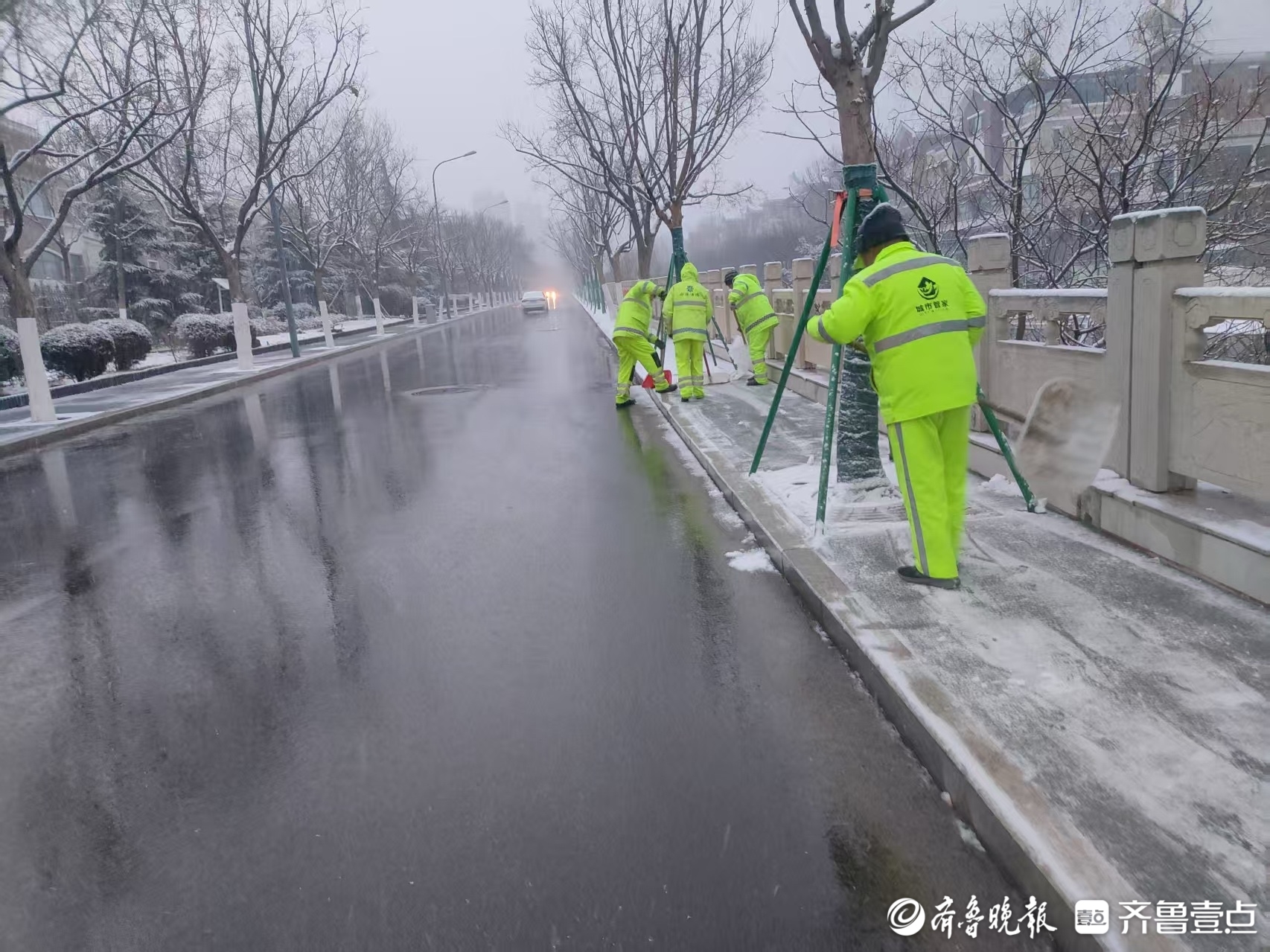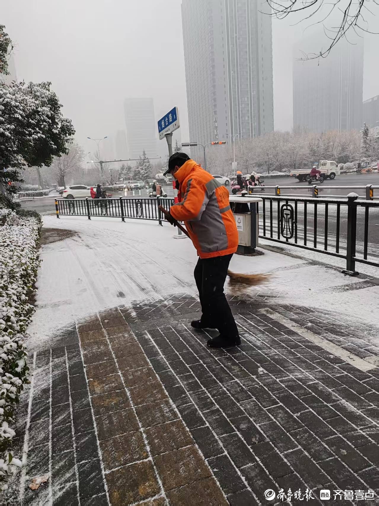 组图|2025年首场降雪已至,泉城环卫人坚守岗位忙碌中 壹现场 2025-01-26 7661 齐鲁晚报·齐鲁壹点 李梦瑶 1月26日,济南迎来2025年首场降雪。在一片白茫茫的街景中,环卫工人一早到达岗位, 他们的工作服显得格外耀眼。他们全副武装,手拿工具,清理积雪,成为雪中一道亮丽的风景线。 责任编辑:王杰