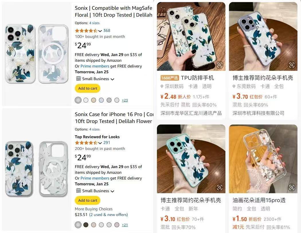 款式类似的手机壳的价格对比,左为国外电商平台,右为国内电商平台。