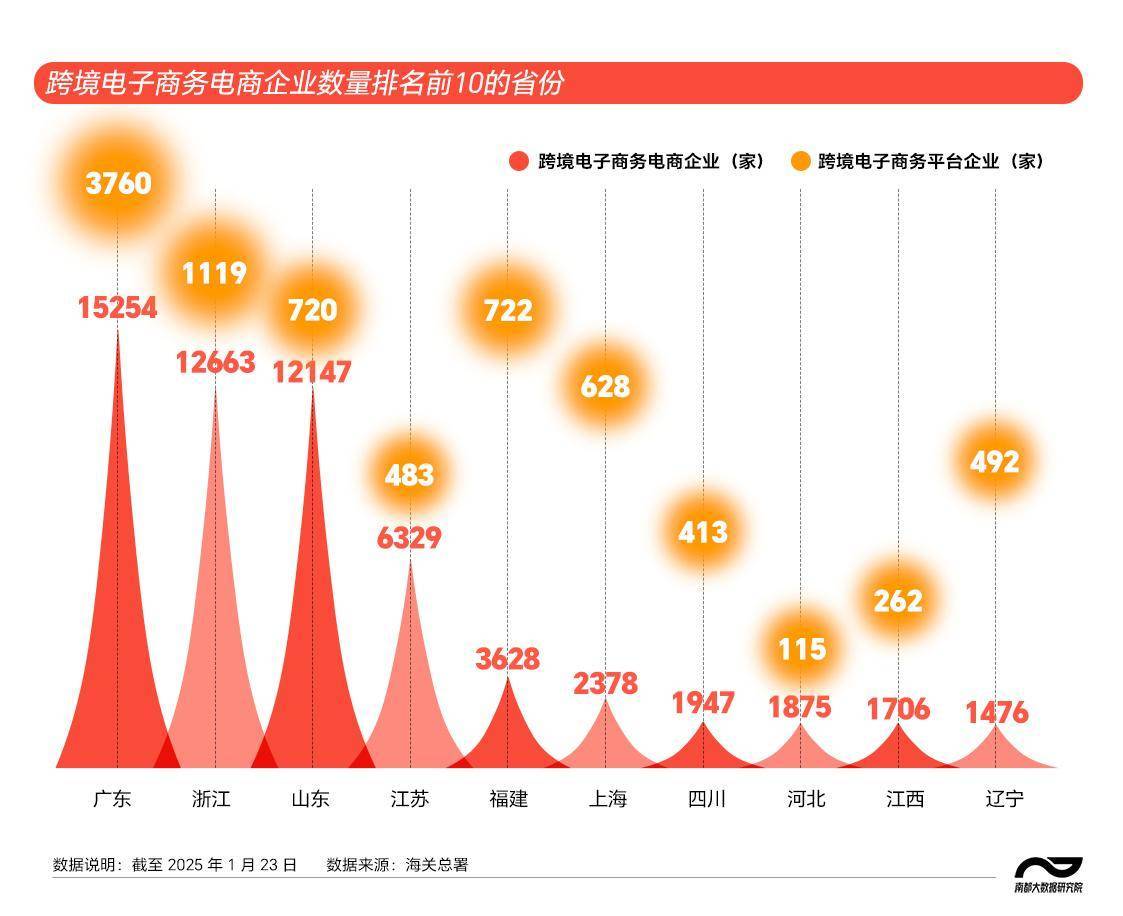 悠久的贸易传统、高水平开放的环境、强大的制造业支撑、敏捷的柔性供应链、发达的物流网络、有力的政策扶持,这些都是广东跨境电商得以蓬勃发展的原因,也是众多跨境电商企业选择扎根在南粤大地的关键所在。南都大数据研究院梳理海关总署公布的数据发现,截至2025年1月23日,全国跨境电子商务电商企业总数高达72956家,其中广东省以15254家位于全国之首,占全国总数的20.9%。也就是说,全国每5家跨境电商公司,就有1家来自广东。