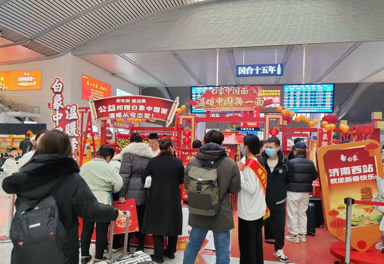 在济南西站候车大厅,国货品牌白象设置的白象中国面温暖驿站(下称“温暖驿站”)悄然上线,为返乡旅客提供免费泡面、应急物品和暖心服务等。据温暖驿站工作人员介绍,驿站由公益赠面区、新春送祝福区和新春暖意区及城市特色打卡区构成,除了免费发放方便面外,还提供热水、口罩、纸巾、充电宝、创可贴、温度计等应急物品,还有寄新年明信片、送福字、赠春联等新春互动活动。