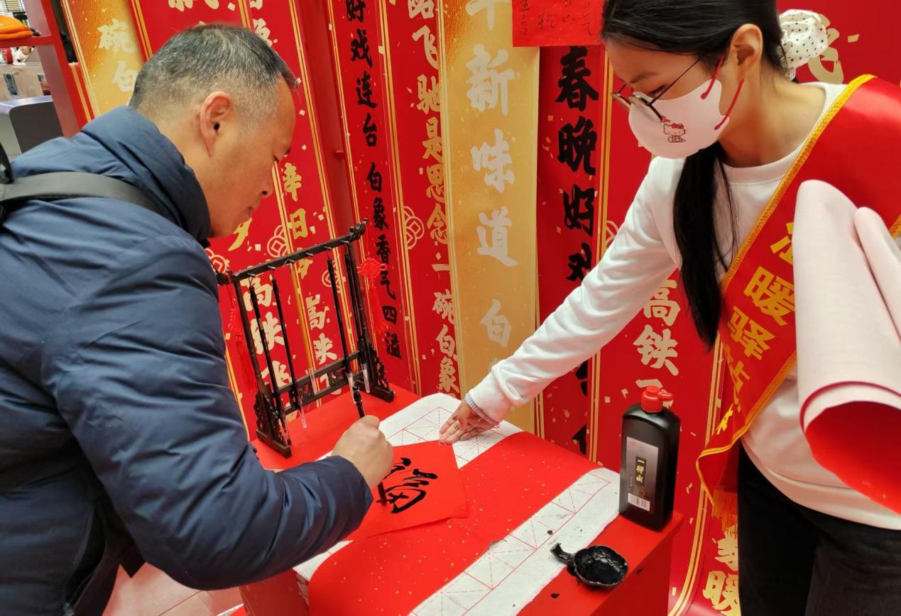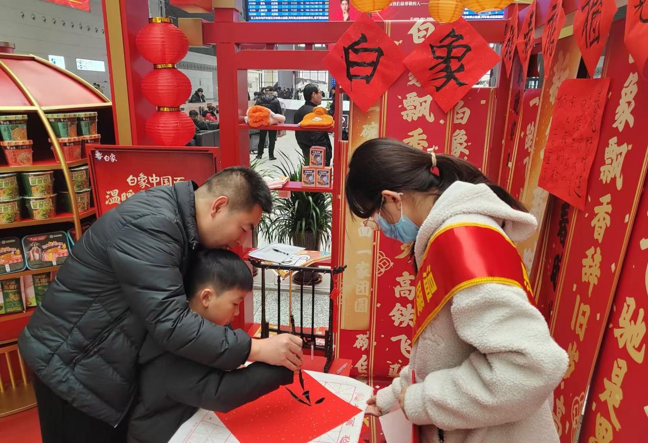 在白象温暖驿站内,红色的春联、福字、大红灯笼等传承千年的文化符号格外醒目,让过往返乡旅客提前感受浓浓的年味。