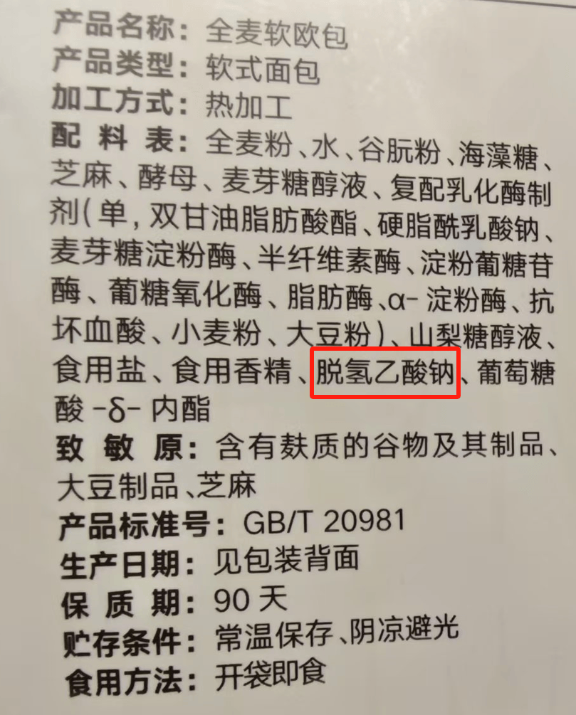 上述“全麦软欧包”,配料表显示含有脱氢乙酸钠。(央广网记者 宓迪/摄)
