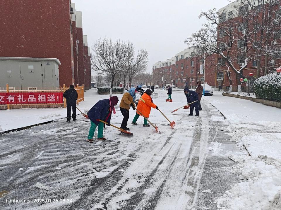 大家手持雪铲、铁锹、扫帚等工具,对小区出入口、主干道以及人行道的积雪进行彻底清理,为居民出行提供便利。尽管天气寒冷,但丝毫没有影响扫雪的热情,大家配合默契,干劲十足,除雪的身影在冬日的小区里形成一道靓丽的风景线,为寒冷的天气增添了别样的美丽。