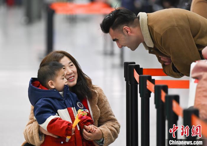 1月27日凌晨,杭州东站候车的留学生(右)和小朋友互动。